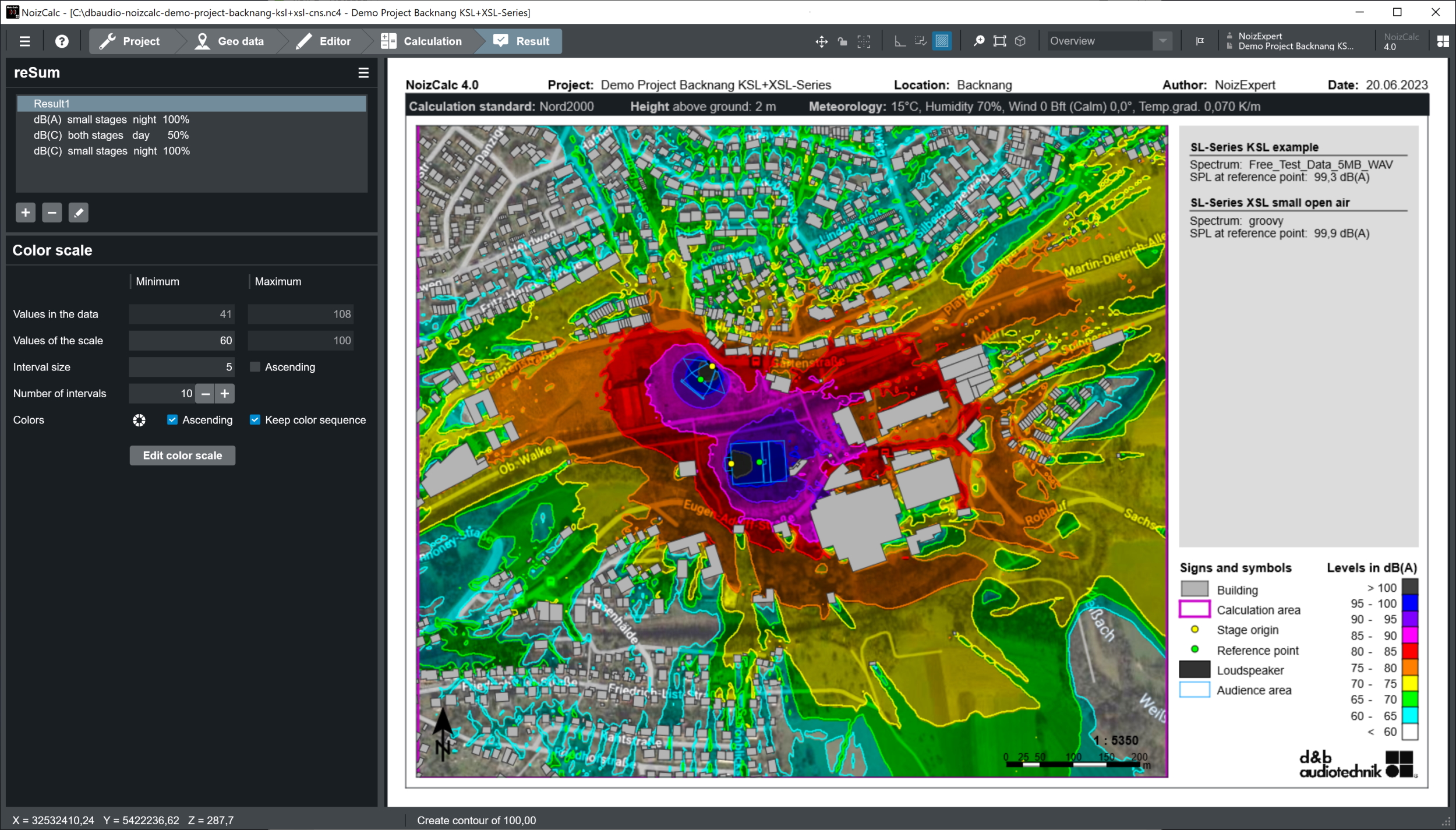 NoizCalc 4.0 wurde in Zusammenarbeit mit SoundPLAN, einem spezialisierten Softwareentwickler für die Simulation von Umgebungslärm, entwickelt und importiert die Systemeinstellungen direkt aus d&b ArrayCalc. Die Software bietet dann je nach Anforderung des Benutzers eine Auswahl an internationalen Normen für die Berechnungen (CNOSSOS-EU, ISO 9613-2 und Nord2000).