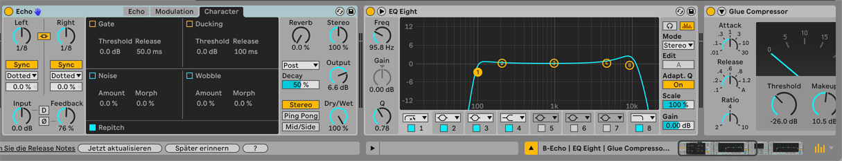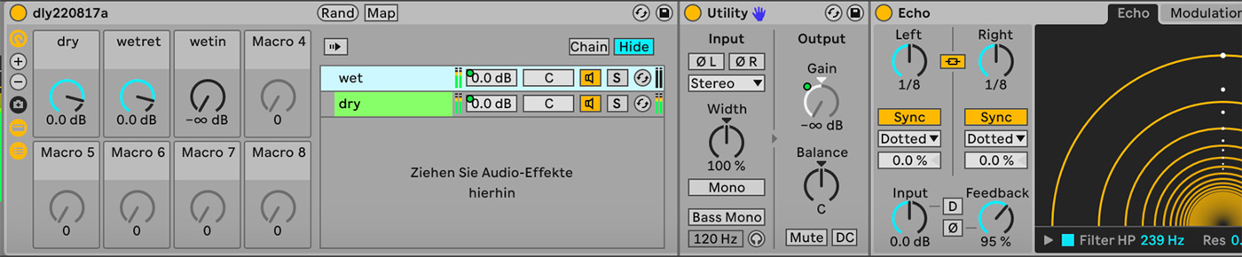 In solchen Racks lassen sich sogenannte Ketten/ Chains erstellen. Diese entsprechen einem Signalfluss-Bus in klassischen Mixern. Dupliziert man etwa bei einem Effekt-Rack eine Kette mit Hall und Delay und leert die Kopie anschließend, kann man im Rack-Bereich zwischen zwei Ketten überblenden (eine mit Effekt und eine mit unverfälschtem Signal) und deren Lautstärke regeln. Das entspricht inhaltlich separaten Dry/Wet-Regelungen. Klemmt man dann noch einen Gain-Regler vor die Effektkette, hat man sich einen sinnvollen internen Send-Regler gebaut, der zusammen mit dem Effekt und dessen Return in die Spur integriert ist.