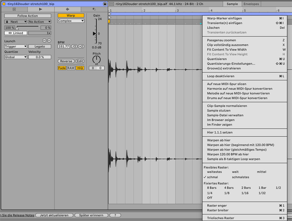 Wann die Edits hier dauerhaft destruktiv, wann nur nicht-dauerhafte Parametereinstellungen sind, ist nicht immer leicht zu durchschauen. Dabei darf nicht vergessen werden, dass in Live ergänzend schon lange die Möglichkeit besteht, nichtdestruktive Quantisierungen mit Groove-Templates vorzunehmen und Groove-Einstellungen komfortabel im .agr-Dateiformat zu verwalten. Das funktioniert besonders gut, weil in Live die Grooves als Klick-Rhythmus auch vorgehört werden können. Es könnte für meinem Geschmack in Live 12 allerdings leichter gemacht werden, ganz banale 1/8 Noten Quantisierungen vorzunehmen.