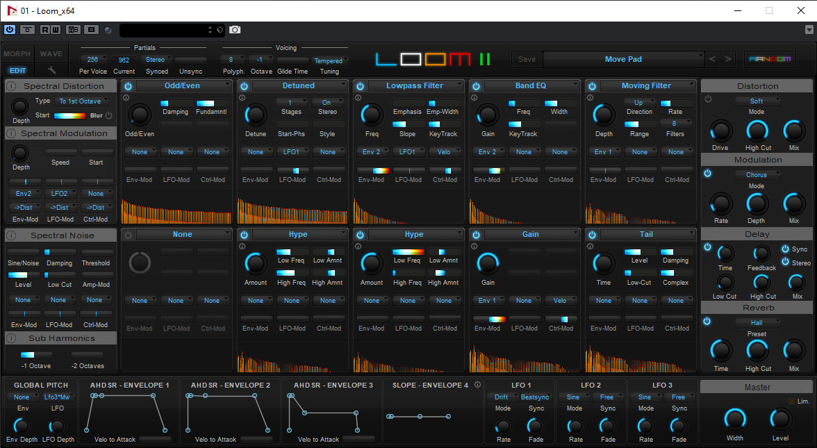 Auf der Edit-Seite (s. Abb. oben) lassen sich verschiedenste Parameter einstellen und es gibt oben Bearbeitungsmodule und unten einen Bereich für Modulation durch Hüllkurven und LFOs. Der obere Bearbeitungsbereich ist nochmal aufgeteilt in spektrale Bearbeitung (links), durch den Anwender anwählbare Module, die in zehn Slot ladbar sind (Mitte), sowie eine Master-Sektion mit Verzerrer, Modulationseffekte, Delay, Reverb und dem Master-Pegel. Für die zehn Anwender-Modul-Slots gibt es fast 40 Module, davon alleine sieben verschiedene Filtertypen.