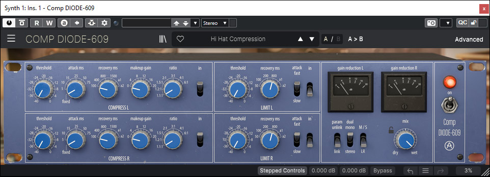 Mit dem "Comp DIODE-609" wird ein Kompressor nach Machart des Neve 33609 geboten - auch wenn Arturia das so nicht konkret benennt. Der Kompressor bietet klassische Kompression, die auch so in vielen Mischpulten zu finden ist, bis hin zum Brickwall Limiter.
