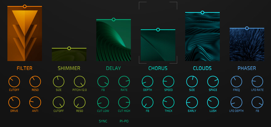 Unterhalb der Granular-Sektion befinden sich eine Effekt-Prozessor-Sektion mit sechs einzeln aktivierbaren Effekten. Ein- und ausschalten erfolgt durch Klicken auf den Effektnamen. Jeder Effekt verfügt über vier Parameter. Folgende Effekte sind implementiert: