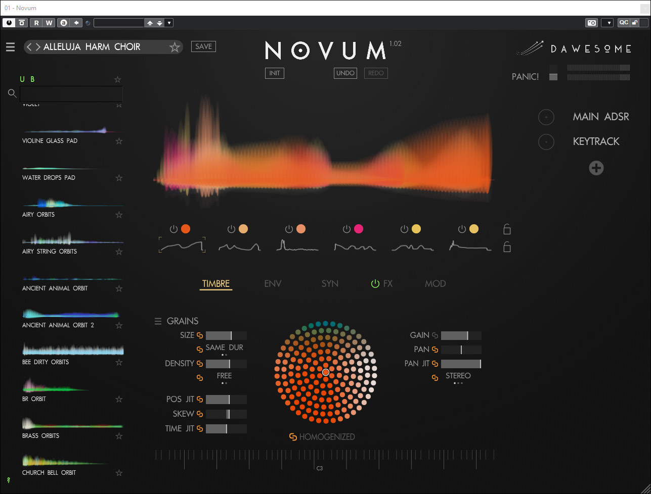 Wir möchten hier das im Juni 2022 vorgestellte virtuelle Instrument "Novum" vorstellen - ein Synthesizer basierend auf Granular-Synthese. Entwickelt wurde es von Peter Vorländer aus Hamburg. Er selbst ist auch als Musiker tätig, trägt aber auch einen Doktortitel der Mathematik und gründete Mitte 2019 seine Firma Dawesome. Sein erster kommerzieller Synthesizer war der Abyss. Schon dieser Synth wartet mit einige Besonderheiten auf, wie die grafische Zusammenstellung eines Sounds, bzw. Klangverlaufs aus einer Palette von vorgegebenen Charakteren. Und natürlich bietet auch Novum, mittlerweile der dritte Synth von Peter Vorländer, im Bereich der Bedienung und Handhabung neben vielem Bekanntem auch Neues. Vertrieben wird Novum, wie auch schon Abyss, über Tracktion.