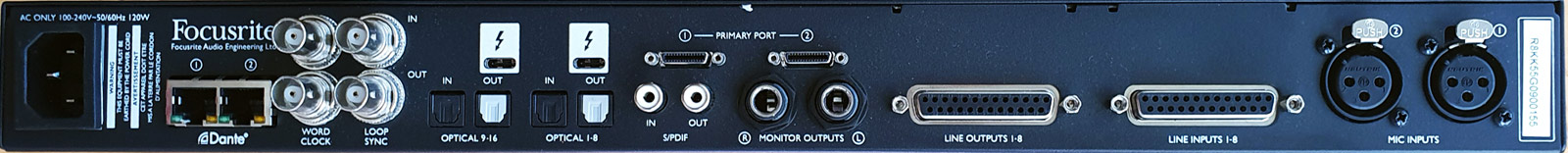 Auf der besagten Rückseite geht es gedrängt, aber übersichtlich zu. Links außen befindet sich der 3-Pol-Kaltgerätestecker für das intern verbaute Netzteil, dass 100 – 240 Volt mit 50/60 Hz verarbeitet und damit weltweit im Studio oder on Tour seine Dienste verrichten kann. Direkt daneben sind zwei RJ-45 Ethernet-Buchsen untergebracht, die eine Kommunikation mit einem Dante-Netzwerk herstellen. Es folgen BNC-Wordclock-Ein- und -Ausgänge und zwei Thunderbolt 3-Anschlüsse.