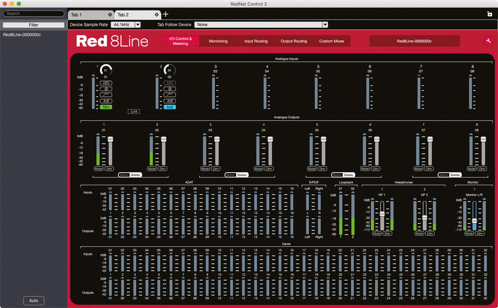 Mit der kostenlos auf der Hersteller-Website herunterladbaren Software „Rednet Control“ lassen sich alle relevanten Parameter des Gerätes am Computer konfigurieren. Insbesondere die Routing-Optionen sind aufgrund der Anzahl digitaler Anschlüsse umfangreich. So lässt sich beispielsweise mit Rednet Control auswählen, ob alternativ zum Cinch-Anschluss S/PDIF-Signale optisch genutzt werden.