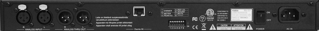 Bis auf die zusätzliche Dante-Funktionalität entspricht der RM-3 dem RM-3DT. Wir haben als Testgerät vom deutschen Fostex-Vertrieb Mega Audio ein RM-3DT für den Test bereitgestellt bekommen. Der RM-3DT ist in einem 1 HE 19"-Gehäuse untergebracht (Bautiefe 284 mm). Das Netzteil kommt mit Spannungen von 100 bis 240 Volt klar (50/650 Hz) und ist so weltweit einsetzbar. Die Spannungszuführung erfolgt über eine Kaltgerätebuchse. Der RM-3DT verfügt neben der Netzbuchse auch über einen Ein/Ausschalter.