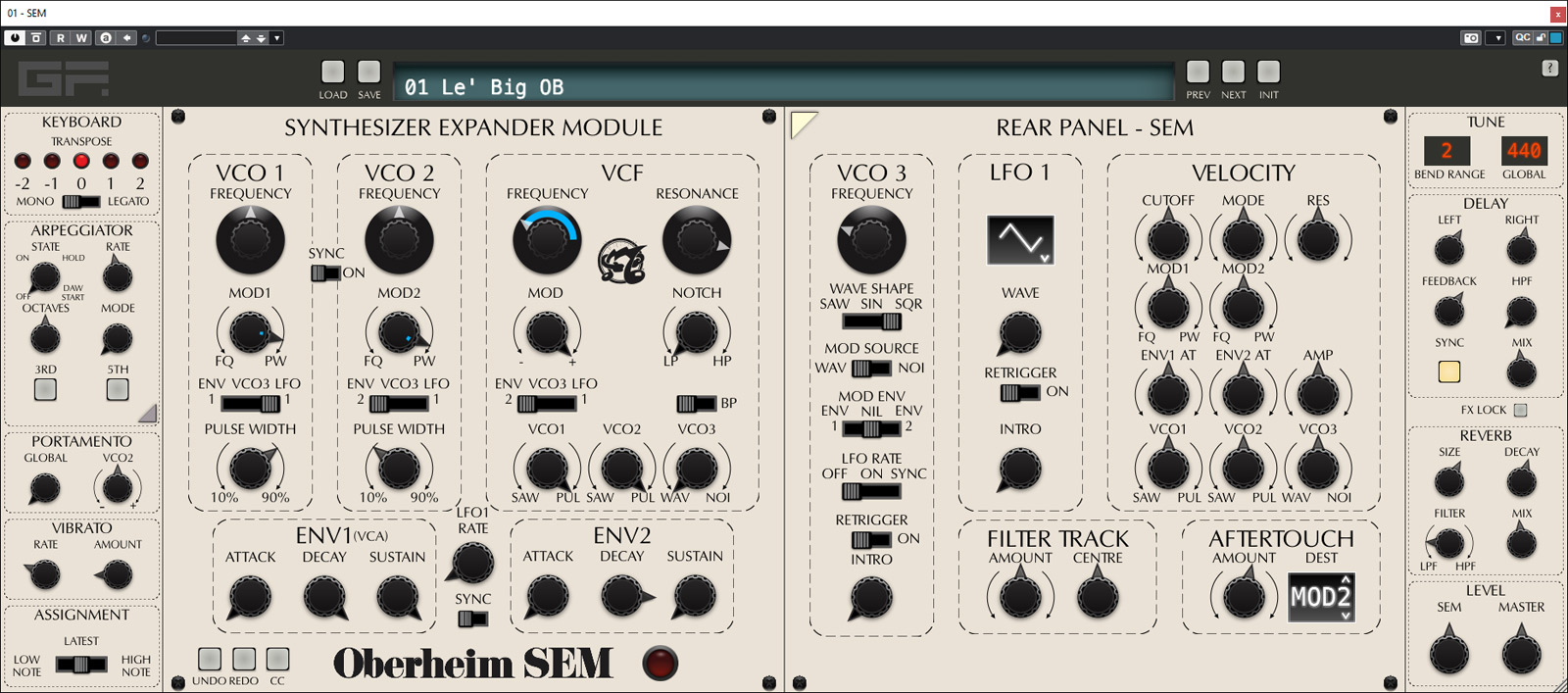 Gegenüber dem Original-SEM-Einzelmodul bietet das GForce Oberheim SEM noch Zusatzfunktionen, die zum Teil auch bei Versionen des Two Voice, Four Voice oder Eight Voice zu finden sind. Diese Zusatzfunktionen beim GForce SEM sind: ein Arpeggiator, Portamento-Kontrolle und Vibrato mit einem zusätzlichen LFO zur Frequenzmodulation der Oszillatoren und auch eine Keyboard-Kontrolle mit Oktav-Selektion, Mono/Legato-Mode sowie für diese Modes auch eine Funktion welche Note zur Auswahl ggf. bevorzugt werden soll (s. Abb. oben).