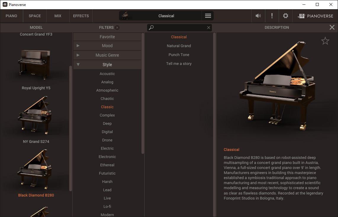 Oben im Kopf werden mehrere Reiter angeboten und zwar PIANO (Instrumenten/Master-Einstellungen), SPACE (Raumsimulation), MIX (Audiobearbeitung) und EFFECTS (Audioeffekte). Wir haben in den Screen-Darstellungen in unserem Test diese mit der Stand-Alone-Software erstellt.