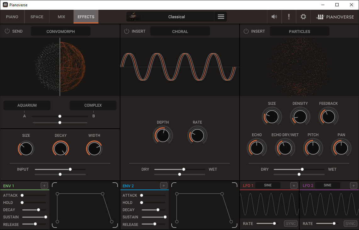 In allen drei Slot lassen sich zwölf verschiedene Effekttypen einbinden (s. Abb. oben). Hier gibt es auch neben klassischen Effekten wie Chorus, Delay, Filter und Hallplatte auch moderne Effekte wie Lo-Fi, Particles und Shimmer oder Convolution Morph, wo über Modulation zwischen zwei Räumen hin und her geblendet werden kann.