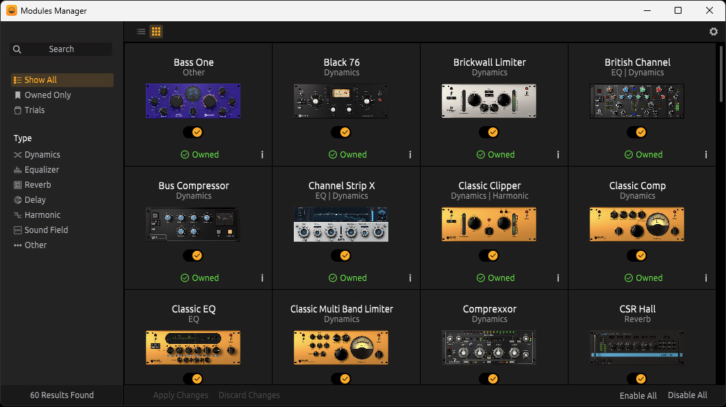 Die Standard-Version verfügt über 19 Plug-Ins und enthalten sind wichtige Kompressoren und EQs wie Black 76, British Channel, Bus Kompressor, Channel Strip X Classic Clipper Opto Compressor sowie auch CRS Hall Reverb, Plate Reverb, Space Delay und auch das Mastering-Plug-In One.