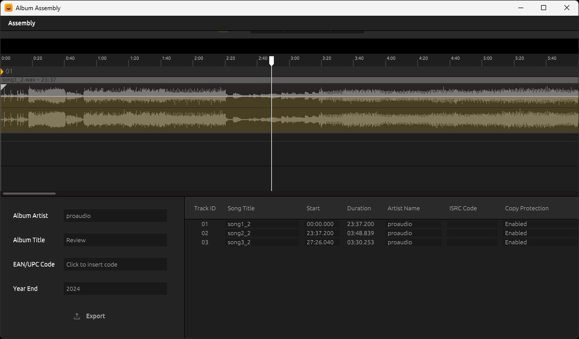 Auf der rechten Seite gibt es auch Bargrafmeter für die Aussteuerung sowie Ausgaben der Lautheitsparameter. Hier lassen sich verschiedene Vorgaben und Standards auswählen. Auf der linken Seite lassen sich Presets abrufen. Es lassen sich in einem Projekt für ein Album mehrere Titel laden. Über einen Editor (Waveform) lässt sich auch ein komplettes Album für eine CD-Pressung zusammenstellen inklusive ISRC-Codes (s. Abb. unten).