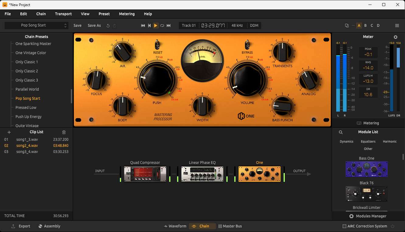 Besonders interessant fand ich das Mastering-Plug-In "One". Hier sind feine EQ-Abstimmung möglich. Es ist ein Allround-Mastering-Plug-In, mit dem man sehr effektiv arbeiten und mit dem man schon alleine, ohne den Einsatz weiterer Plug-Ins, sehr viel erreichen kann.