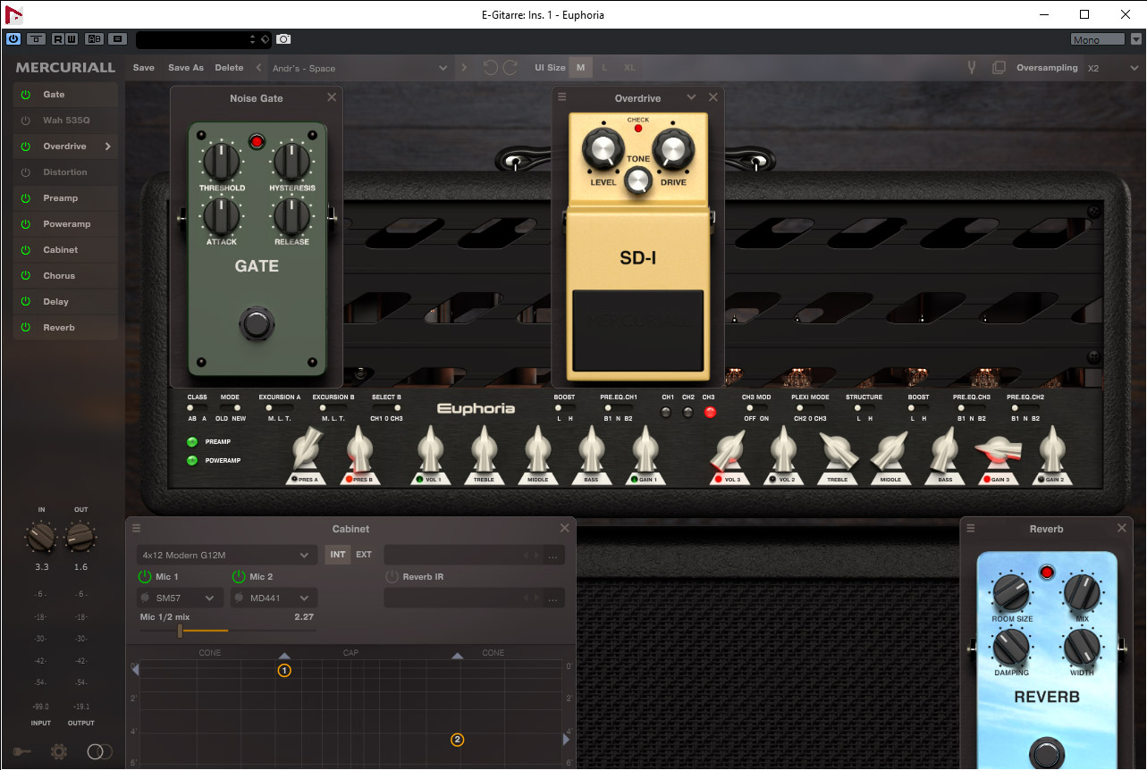 Soweit zum Original. Jeder Hersteller von Amp-Simulationen, bzw. generell bei Simulationen von analogen Audiogeräten, hat so seine speziellen Verfahren zur Analyse und Umsetzung der Simulation in Echtzeit. Bei Mercuriall werden Schaltungskomponenten analysiert und simuliert, aber es kommt auch für sogenanntes Machine Learning zum Einsatz - ein Teilgebiet des Forschungsbereich der Künstlichen Intelligenz - um komplexe, nicht-lineare Gleichungen in Echtzeit umsetzen zu können. Mercuriall setzt sich zum Ziel eine möglichst genaue Umsetzung der dynamischen Vorgänge sowie des Spektrums mit den erstellten digitalen Modellen zu erreichen.
