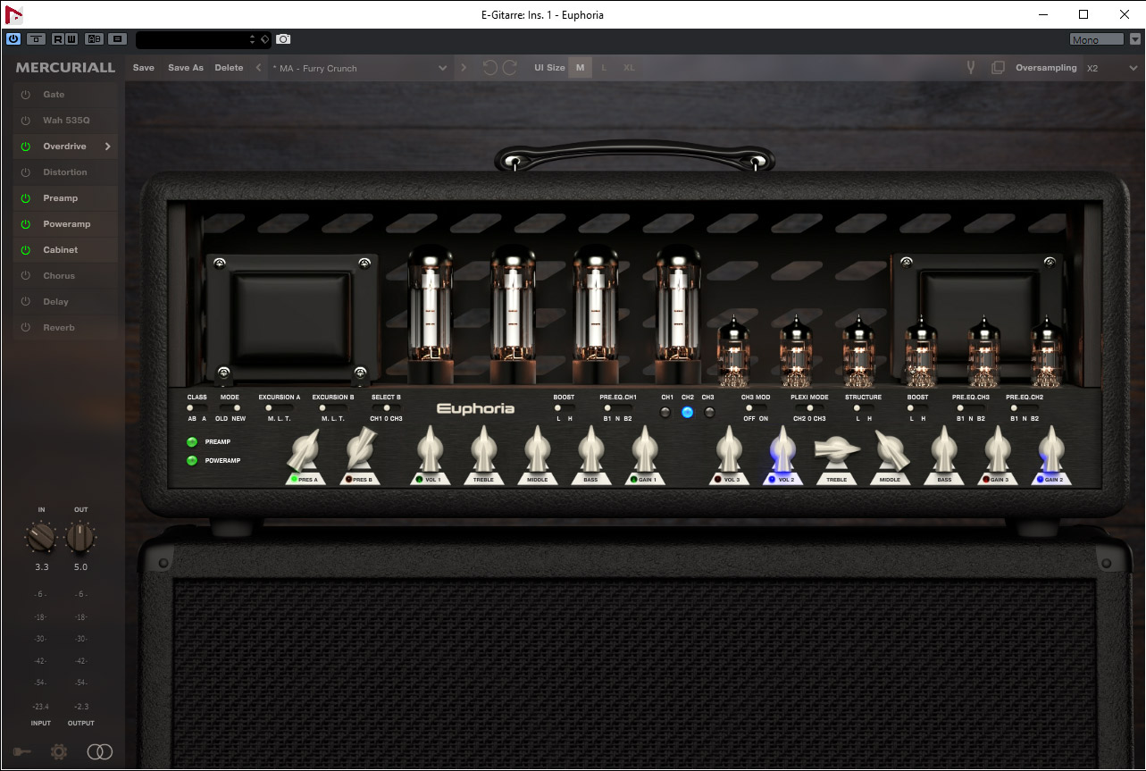 Euphoria basiert auf das 101B mit 12AX7GTR in der Vor- und Endstufe sowie EL34B in der Endstufe. Als Cabinets wird ein 2D Cabinet mit Impulsantworten von Redwirez, ein Bogner Uberkab 412 mit 4 x Celestion G12T-75, MESA/BOOGIE 412 mit 4 x Celestion V30s sowie Marshall 1960B mit 4 x Greenback oder JBL K120 geboten. In der Simulation sind drei Mikrofontypen anwählbar und zwar Shure SM57, Sennheiser MD441 und Royer R121.