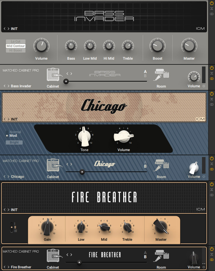 Die drei neuen Amps mit den dazugehörigen Cabinets "Bass Invader" - ein Bassverstärker, "Chicago" mit Anleihen aus den 50er Jahren und "Fire Breather", der sich an britischen Amps orientiert, sind mit einem kleinen Logo versehen und zwar "ICM", was für Intelligent Circuit Modeling steht. Natürlich ist die Zeit nicht stehen geblieben. So hat man die neuen Amps mit einem anderen Simulations-Ansatz entwickelt.