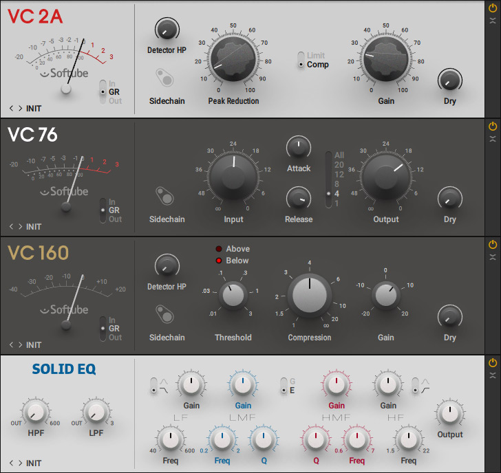 Es sind eine ganze Reihe von neuen Effekten zu verzeichnen. Bei den Kompressoren gibt es die Modelle "VC 2 A", "VC 76" und "VC 160" neu (s. Abb. unten), die in Zusammenarbeit mit Softube entwickelt wurden. Auch bei diesen Namen lassen sich Assoziationen zu den Originalen, bzw. Vorbildern erkennen. Mit "Solid Dynamics" und "Solid Bus Comp" (beide hier nicht abgebildet) werden weitere Kompressoren sowie mit "Solid EQ" auch ein neuer Equalizer geboten (s. Abb. unten, letzte Komponente) - die britische Insel lässt grüßen.