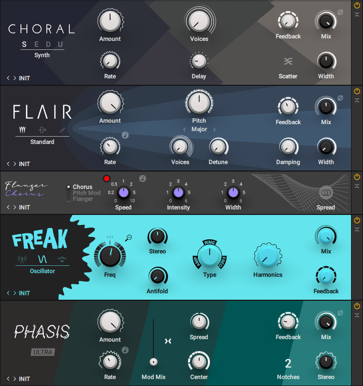 Auch bei den Modulations-Komponenten gibt es einiges Neues (s. Abb. oben), wie: "Choral" (Chorus), "Flair" (Flanger), "Flanger Chorus", "Freak" (Amplituden Modulation) und "Phasis" (Phaser).