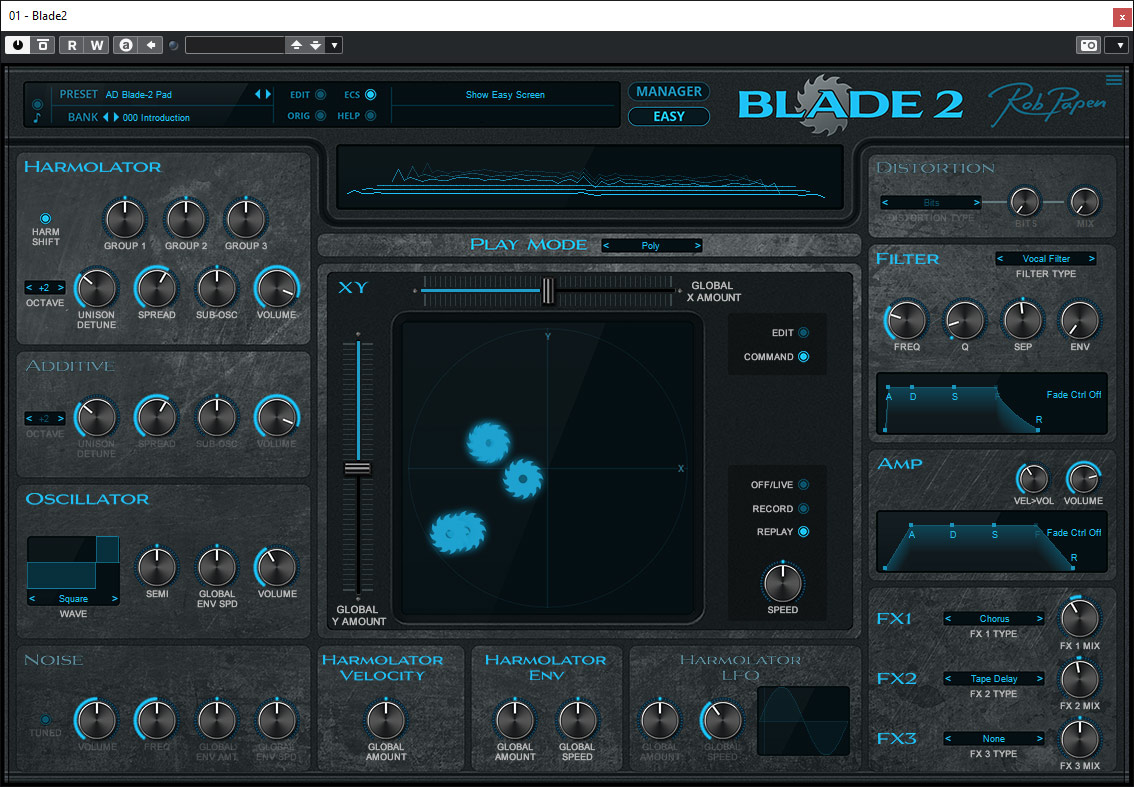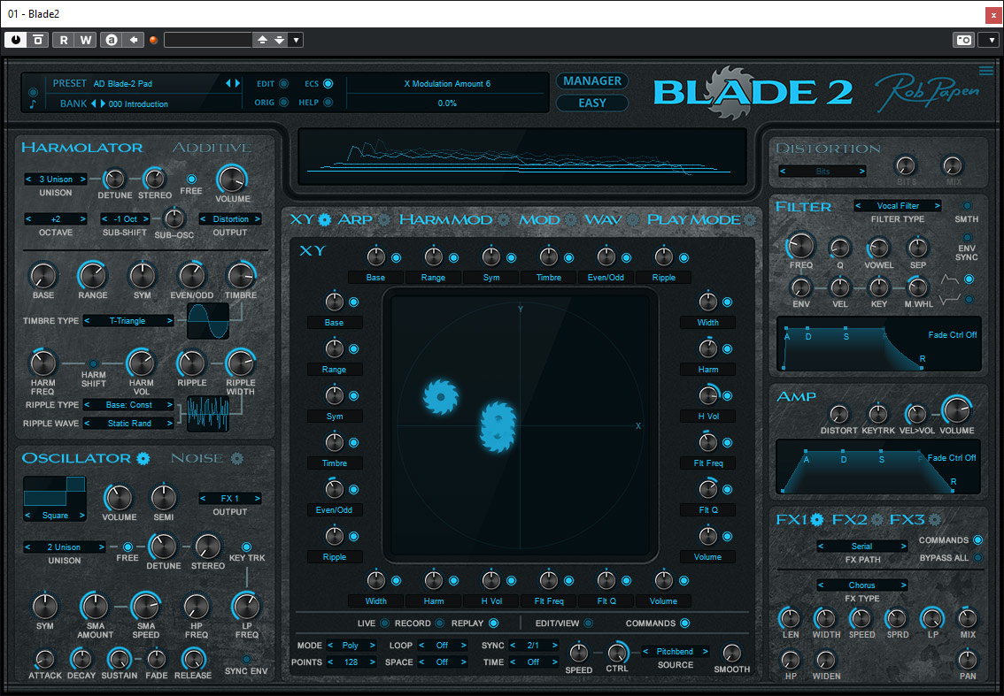 Blade 2 ist ein Synthesizer der primär mit additiver Synthese sowie Morphing arbeitet und mit einer Filter- und Amp-Sektion mit jeweils eigenem Hüllkurvengenerator sowie mehreren Effekten ausgestattet ist. Verfügbar ist ein interner Arpeggiator sowie eine umfangreiche Modulationsmatrix.