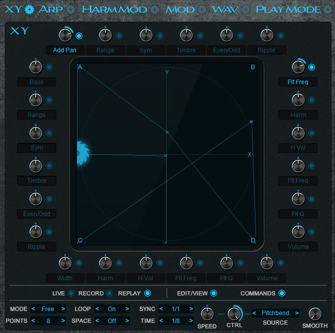 Bei Rob Papen Synthesizer darf ein XY-Pad ja eigentlich nicht fehlen. Hier lassen sich auch Abläufe aufnehmen und nachträglich editieren oder in Echtzeit manipulieren (s. Abb. unten).