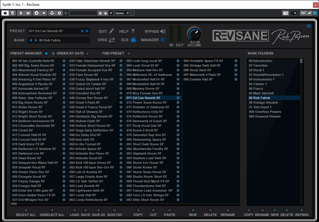 Neu ist unter anderem das Hall-Plug-In RevSane. In der Version 7 kam ja das Delay DelSane hinzu. Mit RevSane gibt es nun ein Reverb was einen sehr dichten Hall generiert und zudem über die Möglichkeit von Modulation von Parametern bietet und so sehr dynamische Halleffekte bietet (s. Abb. oben). Eine umfassendes Preset-Angebot wird hier auch mitgeliefert (s. Abb. unten).
