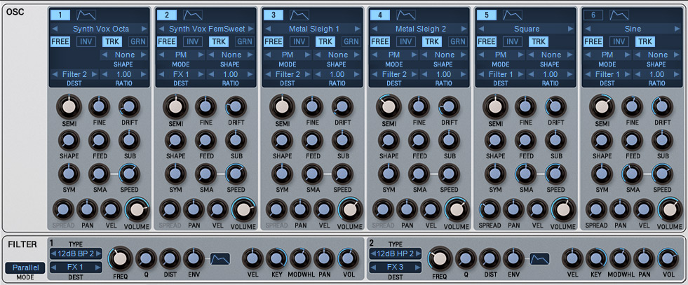 BLUE III ist ein 16-stimmiger Synthesizer mit sechs Oszillatoren pro Stimme mit individuellen Syntheseverfahren als da wären:  Wave und Phase Distortion, virtual Analog, Spectrum Waveforms und Samples sowie FM-Synthese und neu in der Version III nun auch Karplus String Model (Physical Modelling Synthesis).