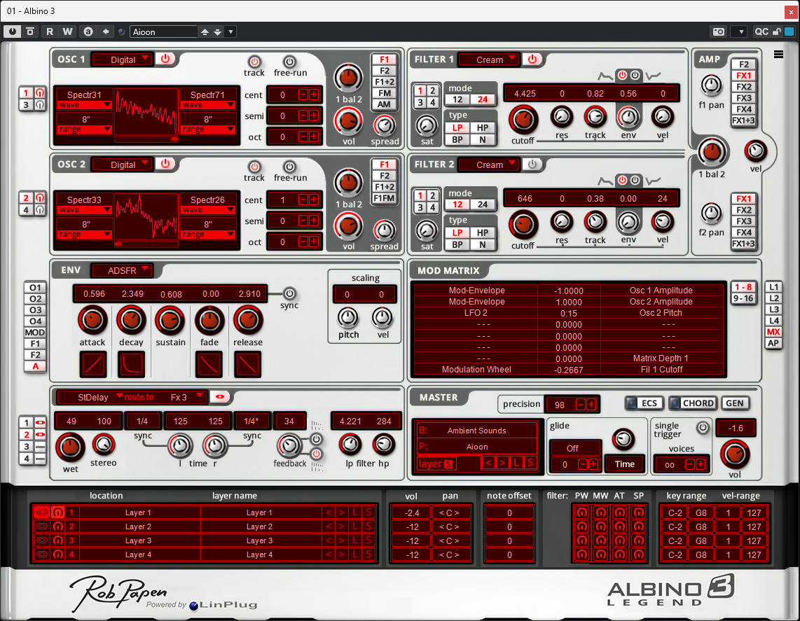 Albinio-3 Legend ist ein Synthesizer mit vier Oszillatoren, zwei Filter, Hüllkurven-Generatoren eine Modulationsmatrix und integrierter Sound-Effekte.