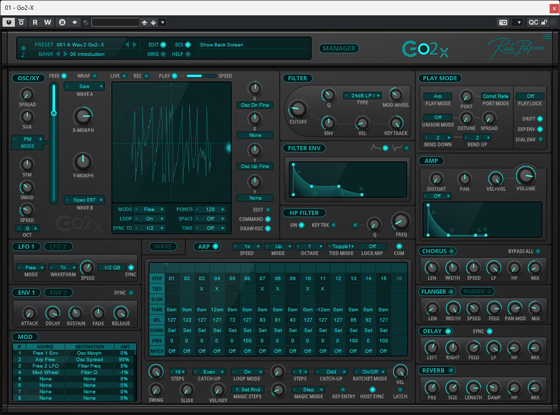 Es gibt für Amplitude und Filter jeweils ein Envelope-Generator. Auch wurden neue Filtertypen bei Go2-X gegenüber Go2 sowie neue Distortion-Typen in der AMP-Sektion hinzugefügt. In der Sektion PLAY MODE lassen sich verschiedene Spielmodi und Unisono-Modi auswählen.