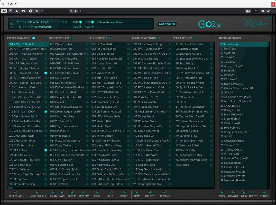 Oben kann man die Bänke und Presets anwählen aber es gibt nun auch einen Preset-Manager.