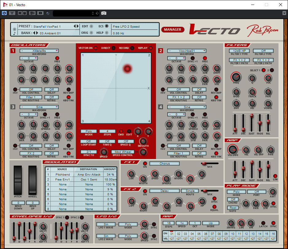 Vecto ist ein klassischer Synthesizer mit Oszillator, Filter und virtuellem VCA sowie Hüllkurven-Generatoren und LFOs. Also zunächst einmal ein  ganz klassischer Aufbau. Vecto verfügt über vier Oszillatoren mit verschiedensten Wellenformen und Samples, bzw. Sample-Loops und zwei steuerbare Filter. Das bemerkenswerte ist, dass über eine XY-Matrix - daher wohl auch der Name Vecto (also von Vektor) - sich die Oszillatoren mischen lassen und sich diese dynamischen Mischungen auch als Automation speichern und wieder abgerufen lassen.