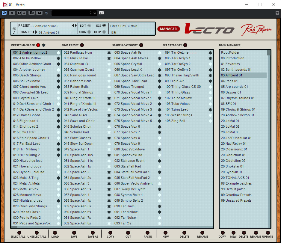 Die Preset-Verwaltung ist bei allen Synthesizer-Plug-In-Produkten von Rob Papen sehr ähnlich. Die Struktur der Presets-Organisation ist dabei so wie man das gewohnt ist. Es gibt Bänke mit jeweils bis zu 124 Presets. Die Bänke und Preset lassen sich auf der Hauptseite über die Kopfzeile ändern oder eben komfortabler über die Preset-Manager-Seite, die man durch Anklicken des roten Labels MANAGER aufruft. Ein Preset kann man als Favorit markieren und jedem Preset lassen sich bestimmte Sound-Kategorien zuordnen und es gibt umfangreiche Suchmöglichkeiten.