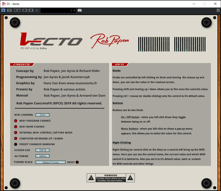 Durch Anklicken des Vecto-Logo ruft man die Seite für die globalen Einstellungen auf, wo sich unter anderem die Grundstimmung und der MIDI-Kanal einstellen lässt und MIDI-Programm-Change und MIDI-Bank-Change sich aktivieren oder deaktivieren lässt (s. Abb. oben). Weiter sind dort neben des Credits auch ein paar erklärende Infos zu finden.