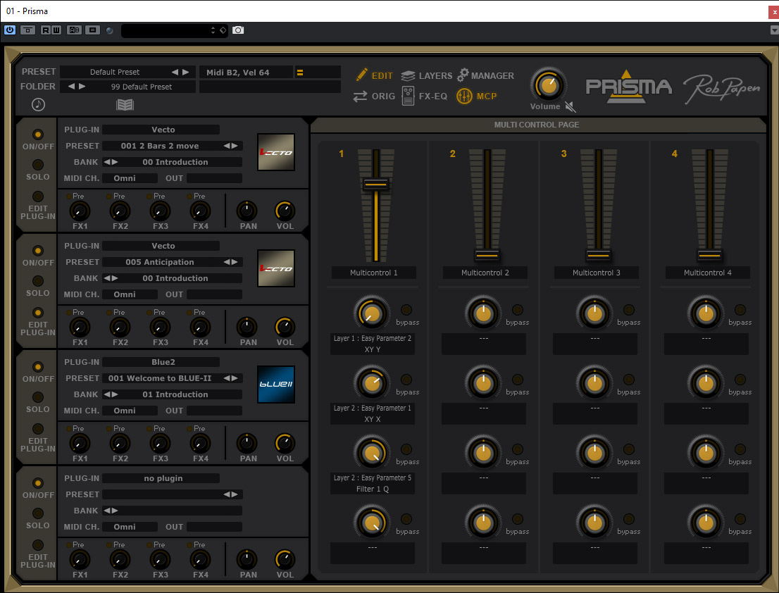 An dieser Stelle möchte ich aber auch noch auf das für Rob Papen-Kunden kostenfreie Plug-In PRISMA aufmerksam machen (s. Abb. oben). Mit diesem Plug-In kann man mehrere Rob Papen Plug-Ins parallel ansprechen. Wenn man hier zum Beispiel einen perkussiven Sound mit Apeggiator mit Pad-Sounds kombiniert, bekommt man sehr interessante und komplexe Klänge. Das kann man natürlich auch auf mehreren Spuren in der DAW realisieren, aber der Clou beim PRISMA ist, dass sich hiermit auch mehrere Parameter, der bis zu vier eingebundenen virtuellen Instrumente, gleichzeitig mit vier virtuellen Controllern steuern lassen. Das sollte man als Nutzer der Rob Papen Instrumente unbedingt mal ausprobieren denn es lohnt sich.
