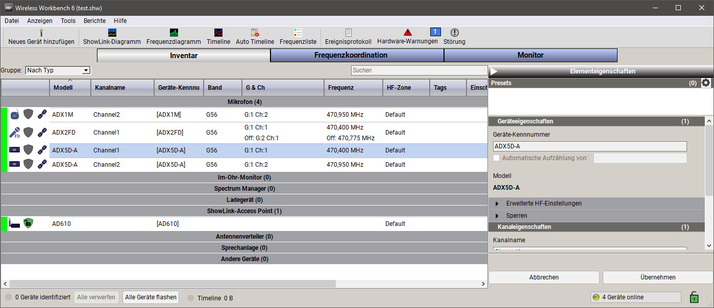 Neben der App gibt es noch die ebenfalls kostenfreie Wireless Workbench 6-Software von Shure, mit der man das Axient Digital-System komplexer managen kann. Hierüber lässt sich auch die ShowLink Netzwerk-ID des ShowLink Access Point AD610 zuweisen. Die Software wird sowohl für Windows (ab Windows 8) als auch für macOS (ab 10.14) angeboten.