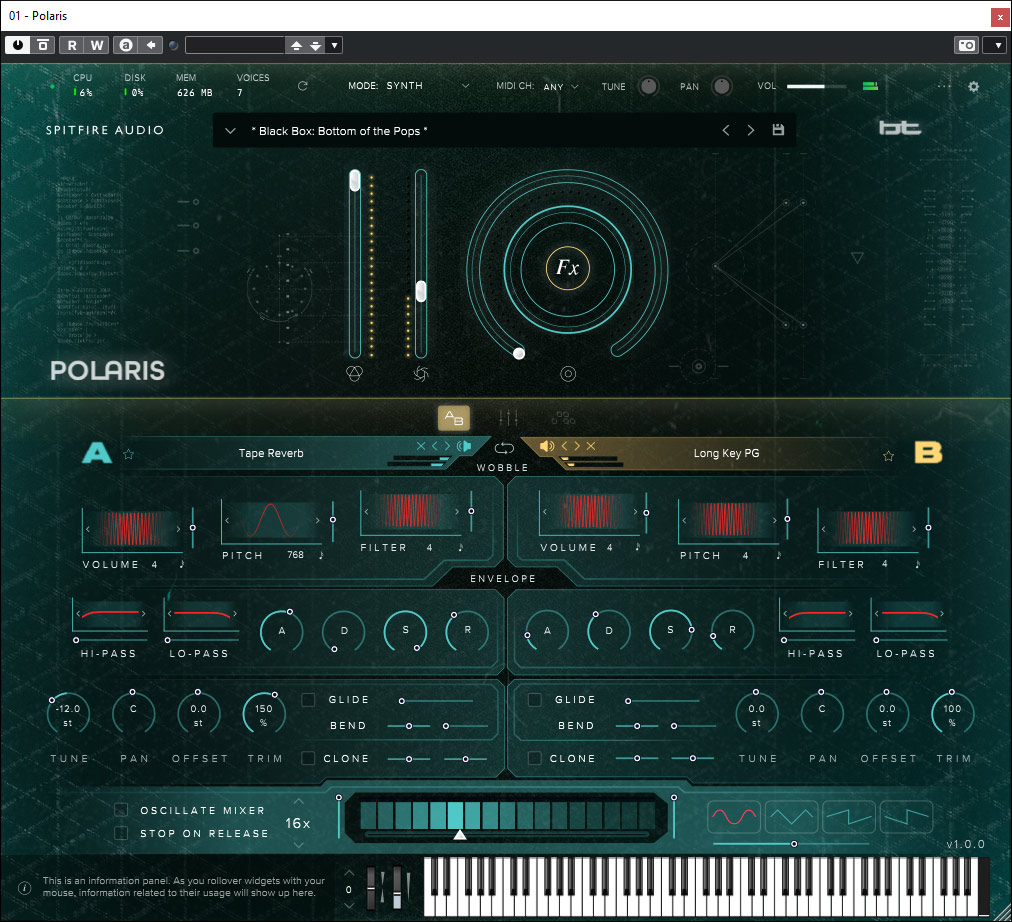 Nun aber zum wichtigstem, den Klang des Polaris. Ab Werk werden 421 Presets geboten, die in der Praxis wirklich sehr gelungen sind. Hier hat sich Spitfire Audio wieder sehr viel Mühe gegeben. Wirklich interessant ist der Synth-Modus. Sehr schön, dass man hier mittels der Überblendung zwischen der Sound Bay A und B manuelle Akzentuierungen realisieren kann, die im Filmmusikbereich zum Bespiel klangliche Anpassungen an dramaturgische Geschehnisse möglich machen. Für die Überblendung von Sound Bay A auf B nutze ich in der Regel das Mod-Wheel (CC=1). Auch positiv anzumerken, dass man über ein Icon im Kopf die Velocity-Kurve anpassen kann. Der Bedarf dafür kommt hier zum Beispiel im Standard-Modus auf, wenn die Spieltechnik-Umschaltung über die Velocity erfolgen soll. Je nach Spielgefühl und Keyboard muss man hier gegebenenfalls optimierend eingreifen. Beim Oscillator Mixer würde ich mir auch noch Modulationsfrequenzen unterhalb von Faktor 0,5 des DAW-Tempo wünschen.