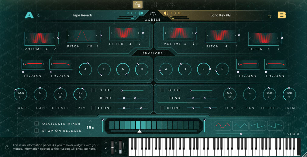 In beiden Betriebsarten wird unten eine virtuelle Tastatur eingeblendet, wo man über die Maus auch einzelne Tasten auslösen kann und es wird gegebenenfalls der nicht mögliche Spielbereich auf der Tastatur angezeigt (grau). Links daneben ist der Hilfebereich. Ist die Hilfe aktiviert bekommt man hier bei Mausover auf einen Parameter einen Hilfetext angezeigt. Bei einem Rechtsklick auf einen Parameter lässt sich ein MIDI-CC anlernen, bzw. löschen.