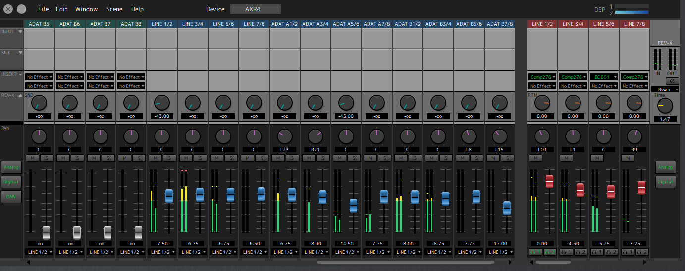 Während des gesamten Tests gab sich das AXR4T keine Blöße. Es traten erfreulicherweise weder Abstürze der DAW, noch Dropouts oder Synchronisationsprobleme auf. Wichtige Parameter wie zum Beispiel Stummschaltung, Oberton-Anpassung mittels Silk-Schaltung sind direkt und schnell am Gerät selbst veränderbar. Das Menü-Handling ist angesichts der Komplexität und trotz Multifunktionsrad kein Genuss, aber angesichts der Parameterfülle nutzbar. Viel mehr Spaß bereitete uns die Konfiguration der Unit mittels Software, die sowohl das Routing als auch Effekteinstellungen mit allen Funktionen erlaubt.