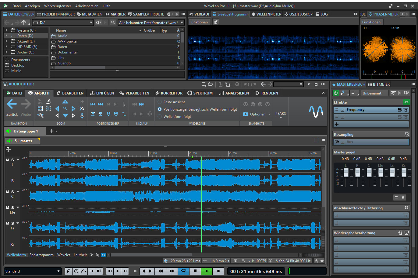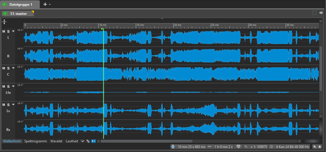 Nach dem Laden (im Beispiel mal eine geladene Interleaved-Datei im, Format 5.1) erfolgt die Zuweisung der Kanäle auf den Spuren und auch bei den Analyse-Werkzeugen, wie zum Beispiel beim Live-Spektrogramm oder beim Phasenmeter, werden die entsprechenden Werte der Kanäle angezeigt (s. Abb. oben). In der Mastersektion werden dann ebenfalls entsprechende Fader und Pegelanzeigen eingeblendet (s. Abb. unten).