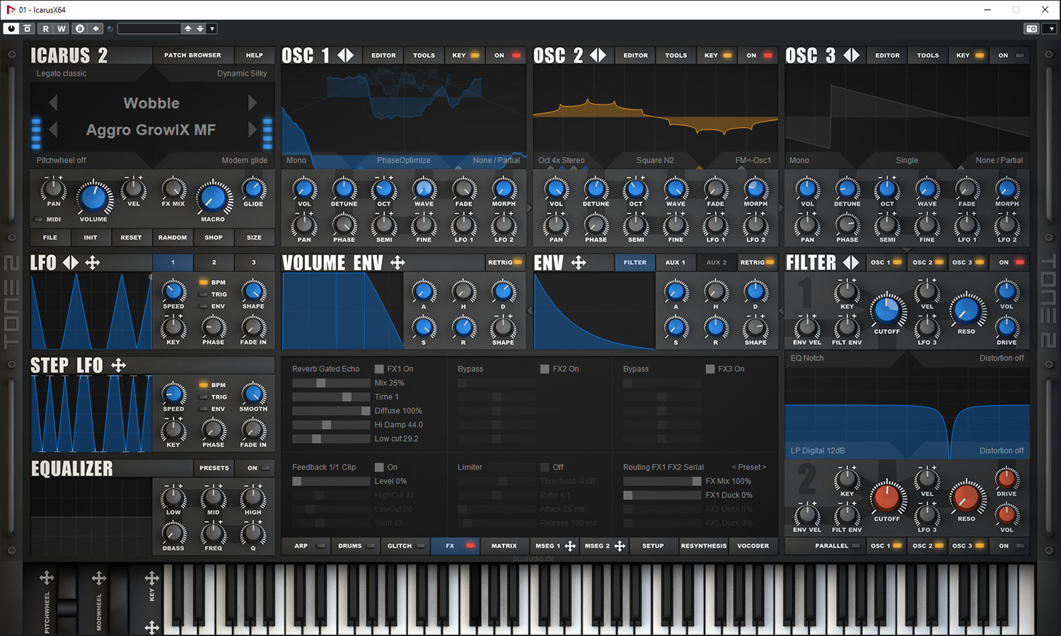 Natürlich verfügt Icarus 2 auch über eine Effektsektion mit drei Effekt-Slots (s. Abb. oben). FX1/2 lassen sich in Serie, parallel oder als Stereo-Effekt (FX1 links, FX2 rechts) routen.