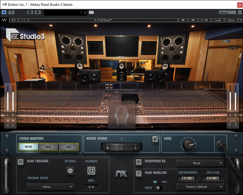 In dem Plug-In lassen sich drei virtuelle Studiomonitore anwählen und zwar Nahfeld, Mid-Field und Hauptmonitore. Der Winkel der Kopfposition im Raum lässt sich über den Parameter STUDIO ROTATE auch manuell verändern, wie natürlich auch der Ausgangspegel über den Regler LEVEL.