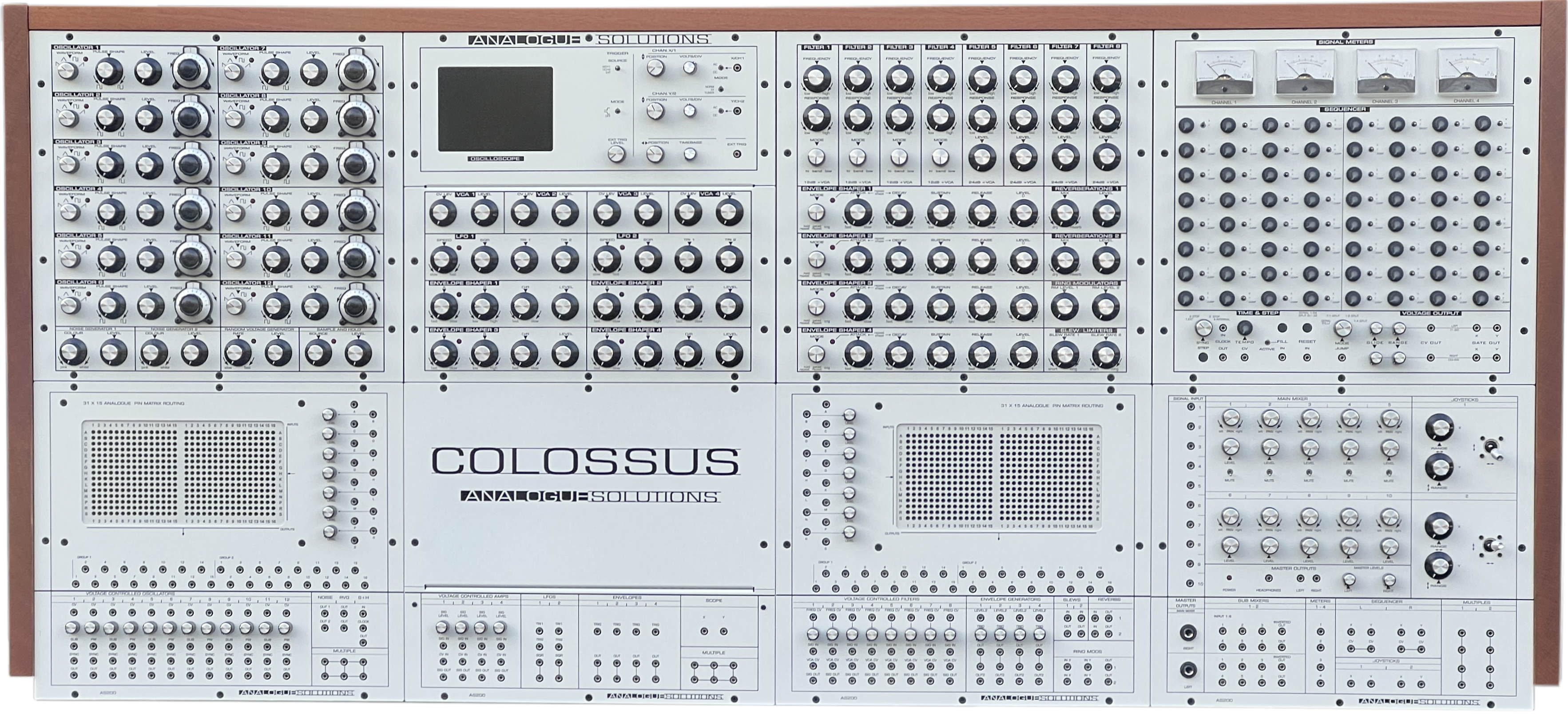 Implementation of Analogue Solutions’ next-to-no-compromise Colossus AS200 Slim design involved no changes being made to its well-stocked so-called ‘VCF Panel’ central to its colossal sound - where FILTER 1 through to FILTER 4 are a 12dB multimode VCF (Voltage-Controlled Filter) design while FILTER 5 through to FILTER 8 are a 24dB low-pass design, all sitting comfortably with four ADSR envelope generators (ENVELOPE GENERATOR 1 through to ENVELOPE GENERATOR 4) each with three trigger modes, as well as two spring reverbs (REVERBERATION 1 and REVERBERATION 2) with three real mechanical springs each, two RING MODULATORS, and two SLEW LIMITERS - and so-called ‘Sequencer Panel’ - itself featuring four backlit moving-coil SIGNAL METERS together with a 64-step CV/Gate SEQUENCER capable of operating in four different playback modes.