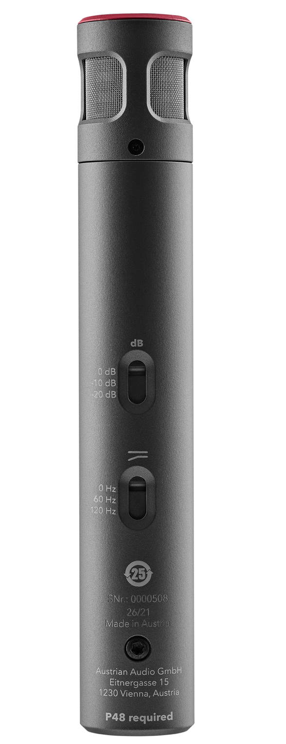 Thanks to the built-in switchable attenuation of 0 dB, -10 dB, and -20 dB, the microphone can be positioned very close to loud sound sources such as trumpets without fear of distortion. Rumble and impact noise are effectively eliminated with the switchable high-pass filter (60 Hz 2nd order, 120 Hz 2nd order).