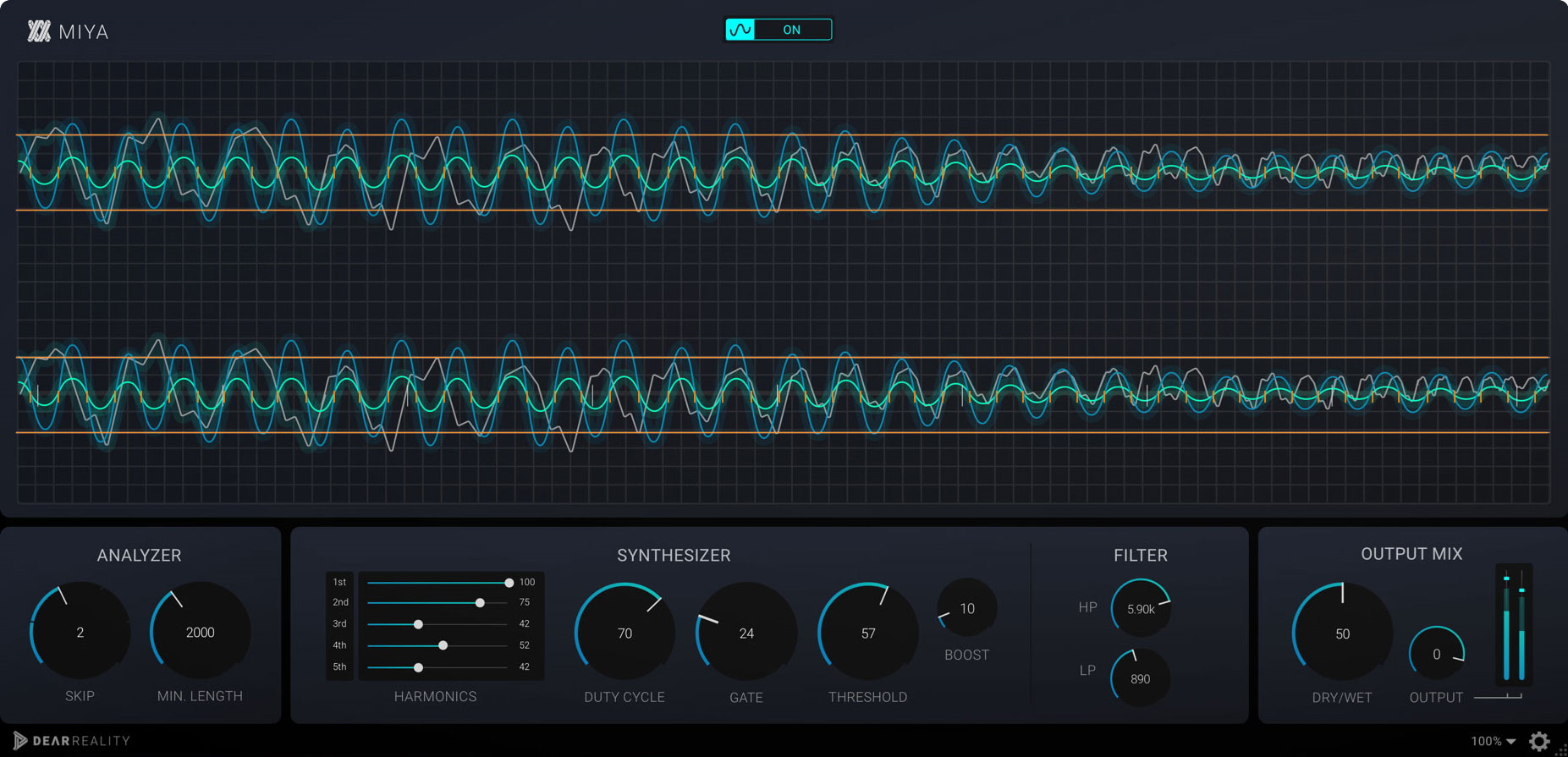 MIYA, Dear Reality’s latest wavelet distortion plugin for audio signals, follows a radically different approach to distortion by creating a wide range of permutations of the original input using adjustable harmonics. Users can re-synthesize their audio and ‘sculpt’ their sounds like on a synthesizer, ranging from slight alterations and subtle textures to gnarly distortion and even massive sub-harmonics.