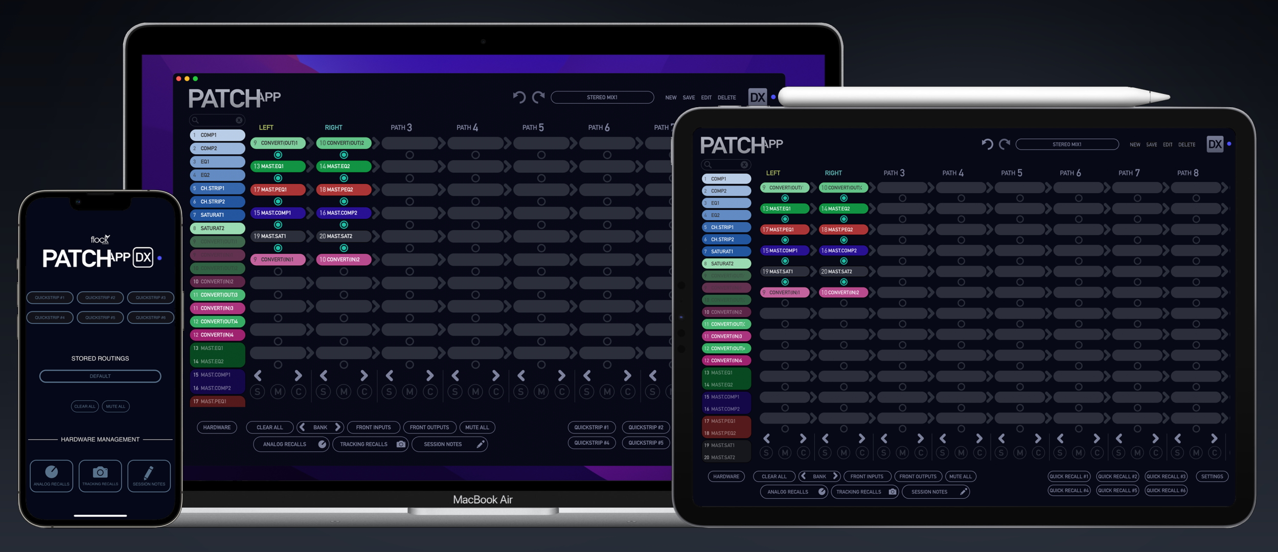 Flock Audio [NAMM Booth 16128, Main Level Pro Audio Hall], the innovative analog routing company best known for their PATCH Series digitally controlled analog patchbays, has stepped into the world of comprehensive hardware management with a powerful premium subscription version of their PATCH APP software, PATCH APP DX. PATCH APP DX expands upon the fast and efficient routing, recall, and multing functionality of Flock Audio’s PATCH APP Classic software by implementing cross platform operation (MAC OS X, iPad, and iPhone), advanced features that assist with speedy and accurate hardware recall, and visual customization options for workflow optimization. PATCH APP DX will be available from the Apple App Store for a subscription price to be announced next month with a 30-day free trial period, while the standard PATCH APP Classic software will remain free for all PATCH Series users with ongoing feature updates.