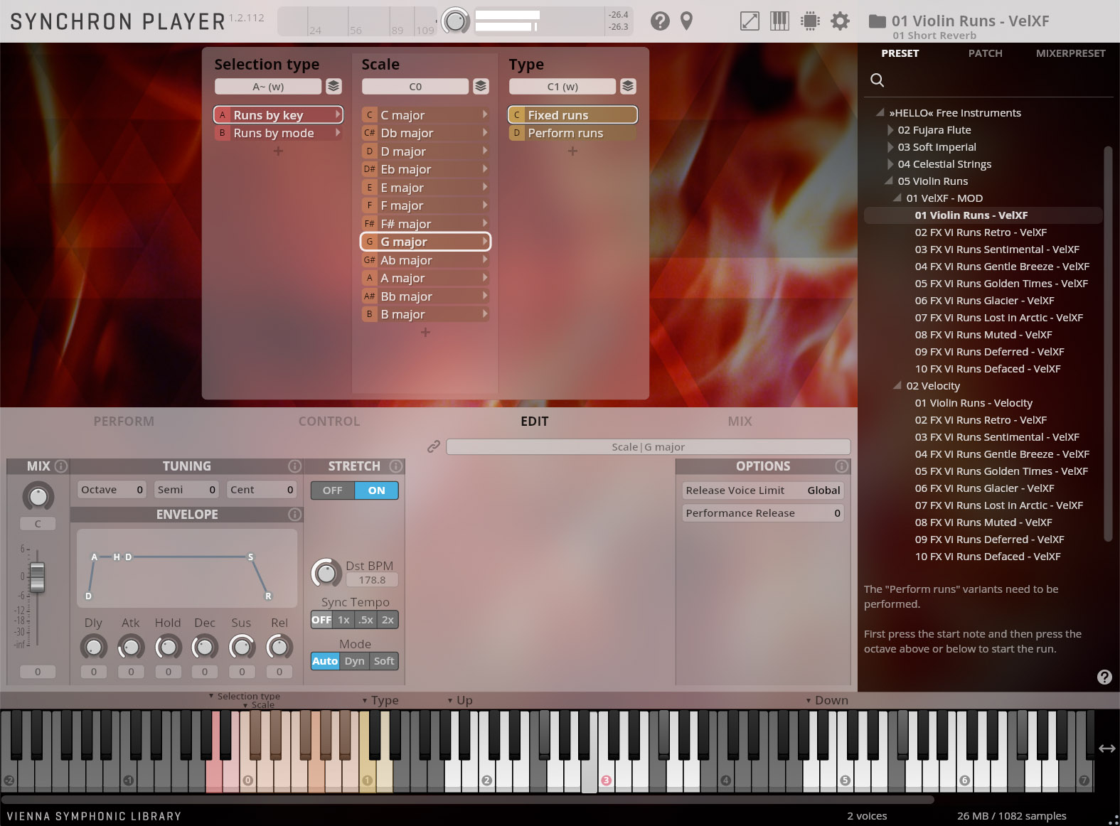 All runs are available in all minor and major scales as well as in Greek modes, always played upwards and downwards. What’s more, they’re all available in two variations: “Fixed runs” trigger a fast run as soon as a key is hit, landing on a long sustained note one octave higher or lower. “Perform runs” work differently: First a long note is played, and once the user presses a note one octave above or below, the run is performed toward that target note, which is then sustained again. It’s also possible to create beautiful longer passages by connecting upwards and downward runs, or by adding variations through triggering only a part of the runs.