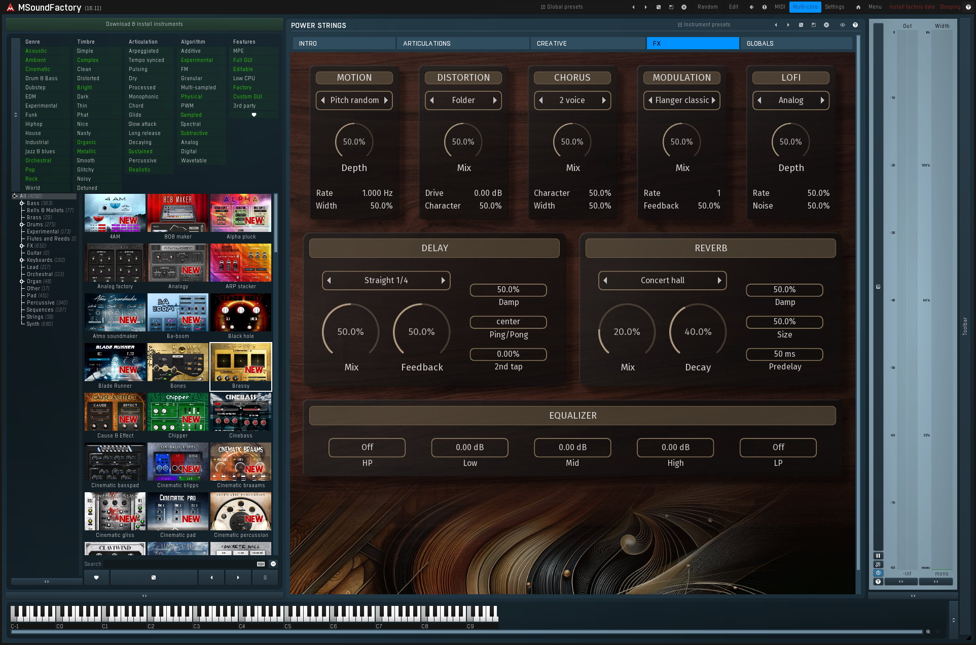 When working with PowerStrings there is no need, necessarily, to turn to third-party effect plug-ins for finalising the sound since the premium instrument includes its own REVERB (offering five types of room and hall) alongside an advanced DELAY and five-band EQUALIZER, plus MOTION, DISTORTION, MODULATION, and LOFI effects - more than enough, surely, to boost creativity in the highly unlikely event of PowerStrings failing to inspire in its musical mission of facilitating quickly crafting symphonic strings for modern pop or cinematic productions.
