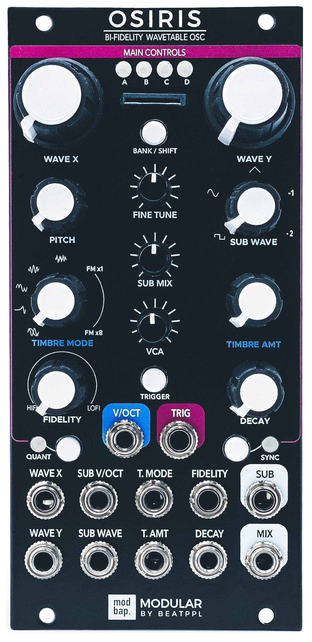 Modbap Modular by BeatPPL, a black-owned developer of Eurorack modular synthesizers and instruments made in America, introduces Osiris - operating powerfully as a (frequency modulation- and phase modulation-including) seven-plus TIMBRE MODE 12HP BI-FIDELITYTM WAVETABLE OSC (oscillator) module, neatly-packed with an independent sub-oscillator, LOFI processing, extensive CV (control voltage) modulation capabilities, a PITCH quantiser, four banks of 32 x 32 wavetables per bank, the ability to load user wavetables via Micro SD card (not included), and its own free open-source wavetable editor (OsirisEdit) - at Knobcon Number Nine, Hyatt Regency Schaumburg, IL, USA, September 10-12, 2021…