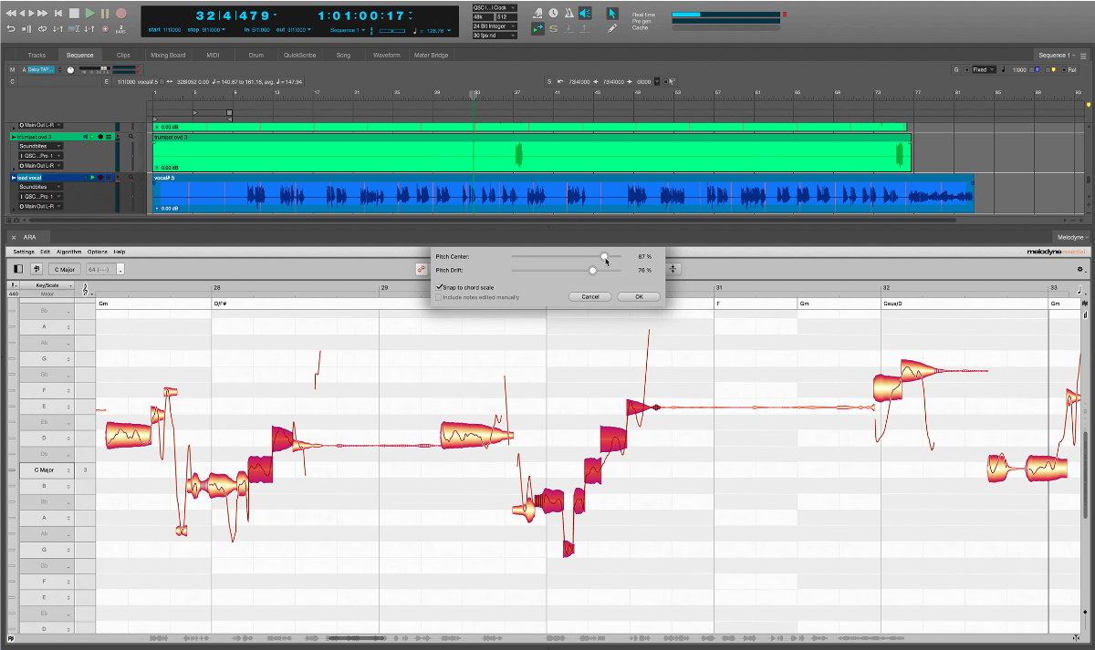 In Digital Performer 11.2, thanks to ARA it is now possible to open audio tracks in Melodyne directly and without tiresome transfers. That makes using Melodyne far simpler and more intuitive.