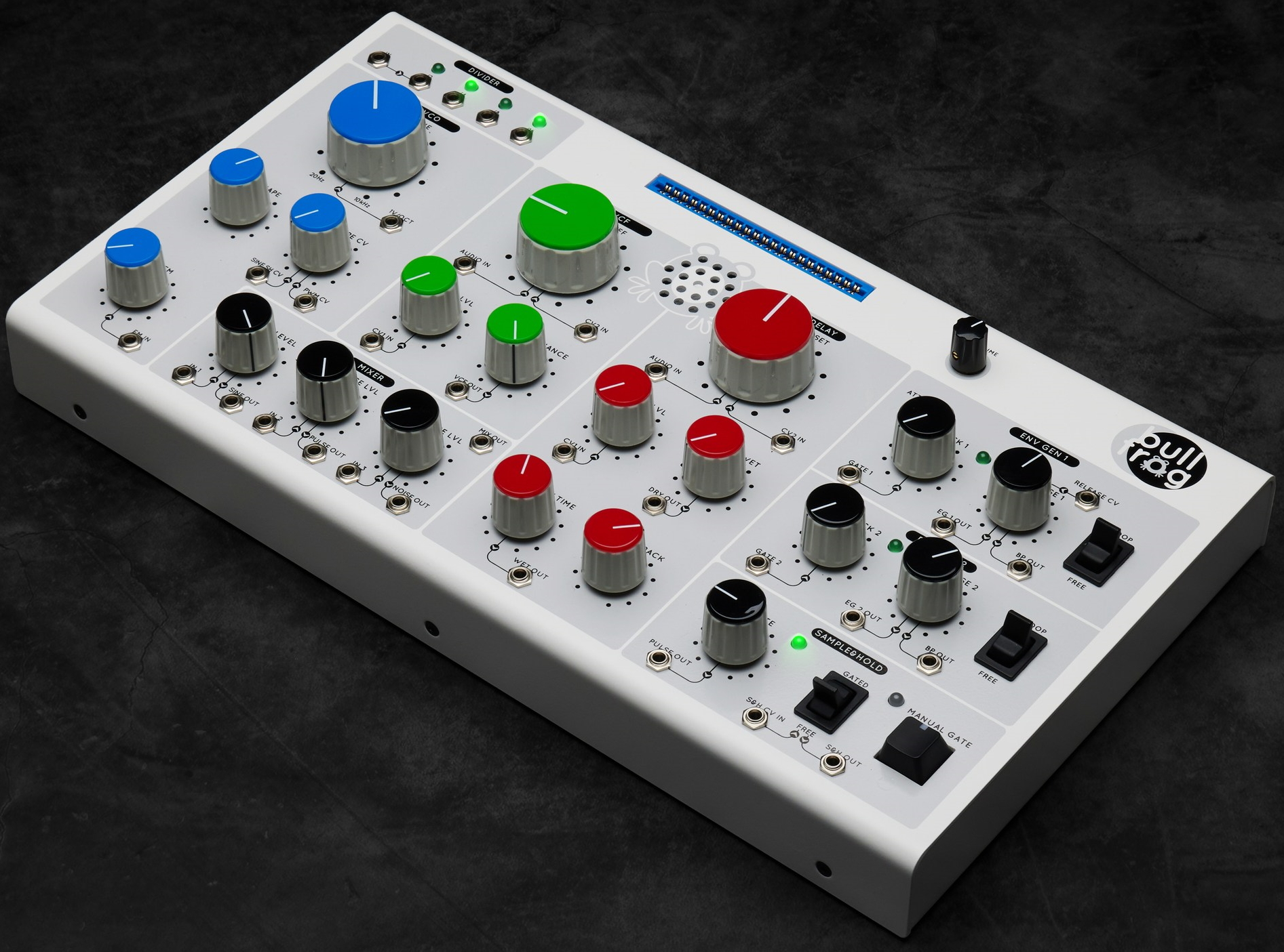 Bullfrog is a classical subtractive synthesiser – it consists of several “modules” for sound generation – VCO, NOISE GENERATOR -and treatment – VCF, VCA/DELAY, as well as “modules” that generate control and modulation signals to control them – ENVELOPE GENERATORS and SAMPLE & HOLD. The Bullfrog will not make the sound on its own unless it is patched – using eurorack patch cables to interconnect the “modules” or by inserting voice cards that create internal connections between the “modules” in a specific way and add extra functionality, like sampler/looper, sequencer, groovebox, etc. This approach better helps to understand functionality of a subtractive synthesizer and the principles of sound design with instruments like these.