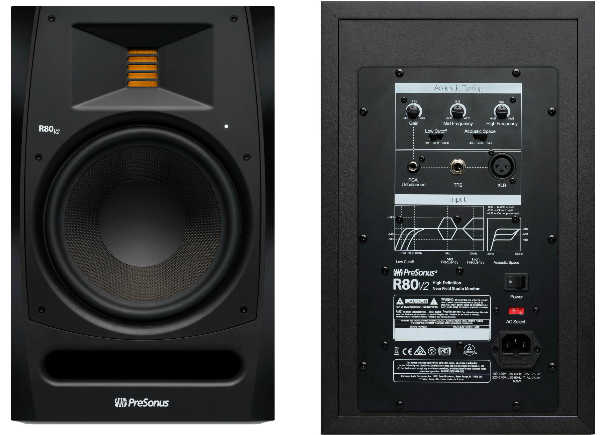 PreSonus is now shipping its second-generation R65 V2 and R80 V2 active AMT studio monitors. The new monitor speakers feature more extensive control than the original R-series, incorporating the analog Acoustic Tuning controls from PreSonus’ celebrated Eris line. You get Low Cutoff, Mid Frequency, and High Frequency controls, as well as a three-position Acoustic Space switch that allows you to compensate for the acoustic results of speaker placement against a wall or in a corner. An upgraded 140W (75W LF + 65W HF) Class A/B power amplifier provides ample headroom and even warmer, smoother overall frequency response for distortion-free, non-fatiguing performance, even at higher volumes.