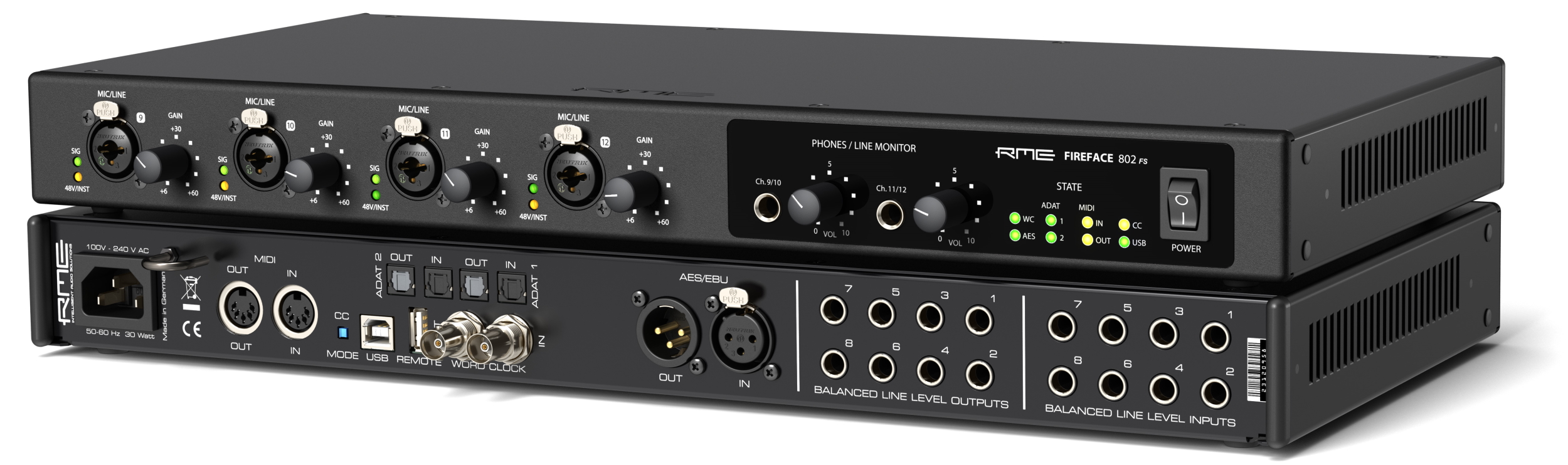 The Fireface 802 FS AE is a highly integrated pro audio solution for live and studio use in a 19” enclosure and offers 60 audio channels, high-end microphone preamps, reference class converters, a complete effects section and operation at up to 192 kHz. Active SteadyClock FS jitter suppression, DC-coupled outputs for all 8 analog line outputs, individually switchable reference levels for all inputs and outputs, full stand-alone functionality and identical operation on Windows PC and Mac complete the package.